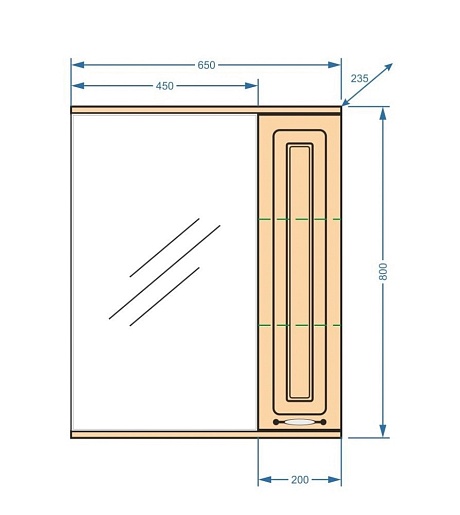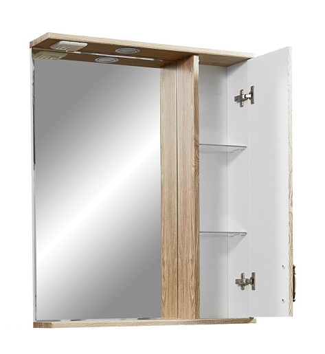 Описание: влагостойкое зеркальное полотно, полочки, шкафчик, подсветка.