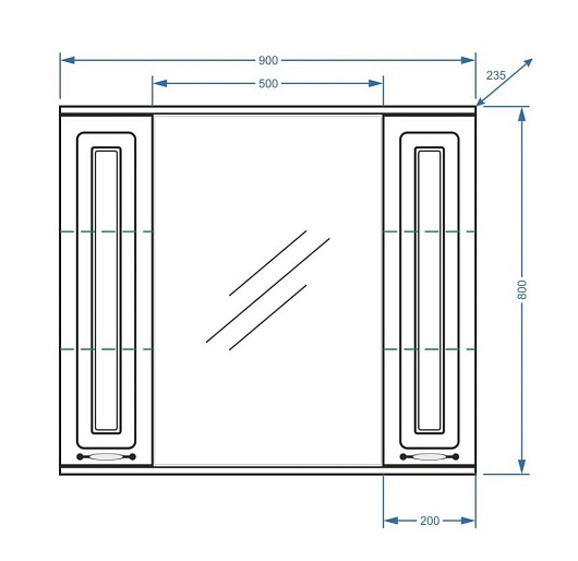 Описание: влагостойкое зеркальное полотно, полочки, шкафчики, подсветка.
