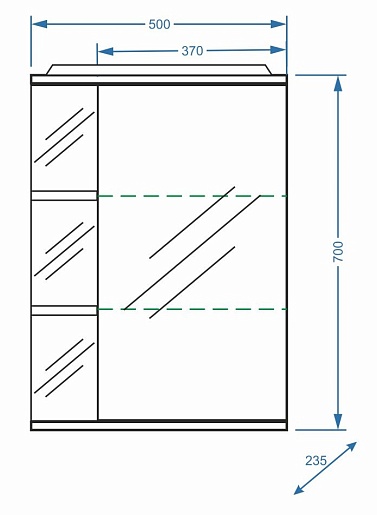 Описание: влагостойкое зеркальное полотно, шкафчик, открытые полки, подсветка.