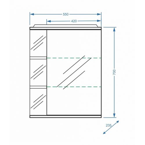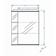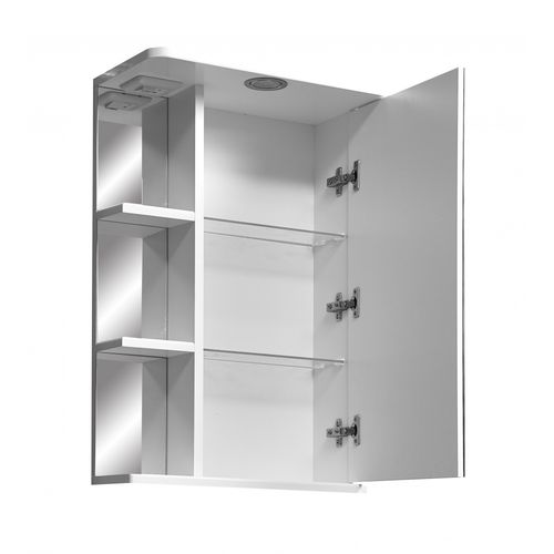 Описание: влагостойкое зеркальное полотно, шкафчик, открытые полки, подсветка.