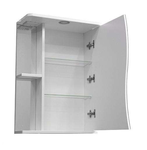 Описание: влагостойкое зеркальное полотно, шкафчик, открытые полки, подсветка.