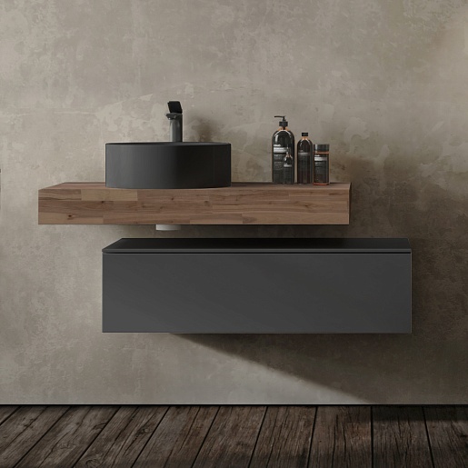 - Столешница из натурального массива в сочетании с модульными тумбами, создает единый образ из отдельных элементов, собирая композицию в единое целое. Характеристики
