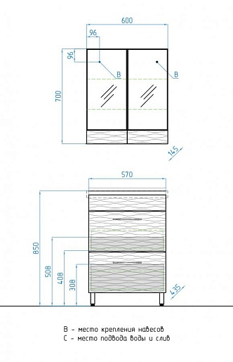 - напольная тумба под раковину: 2 выдвижных ящика на направляющих плавного закрывания.