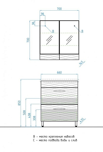 - напольная тумба под раковину: 2 выдвижных ящика на направляющих плавного закрывания.