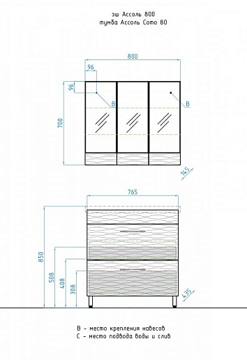- напольная тумба под раковину: 2 выдвижных ящика на направляющих плавного закрывания.