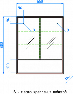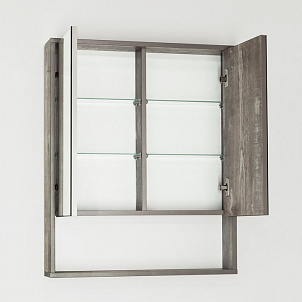 Описание: две распашных зеркальных дверцы, стеклянные полки, открытая полка. Корпус ДСП с покрытием пленкой под дерево.