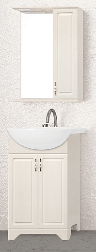 Описание: зеркальное полотно с распашным шкафчиком и нижней полкой. В козырьке встроенный светильник, выключатель с розеткой. Декоративная фрезеровка фасада, декорированные ручки "под бронзу" с керамическими вставками и изящным рисунком. Стеклянные полочки в зеркальных шкафах. Край полочек имеет трапецевидную еврокромку. Прозрачные полкодержатели с фиксацией