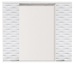 Описание: зеркальное полотно с распашными шкафчиками и нижней полкой. В козырьке встроенные светильники, выключатель с розеткой. Декоративная 3D-фрезеровка фасада. Фацет на зеркале, стеклянные полки с еврокромкой и прозрачными полкодержателями.