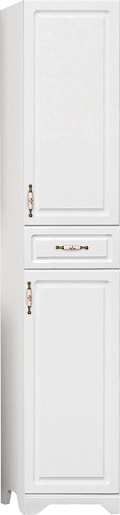 Описание: Напольный пенал для ванной с двумя распашными дверцами и выдвижными ящиками. Декоративная фрезеровка фасада, декорированные ручки "под бронзу" с керамическими вставками и изящным рисунком.