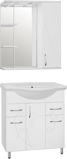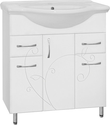 - напольная тумба под раковину: 3 распашных дверцы, 2 выдвижных ящика, хромированные ручки, ножки. Декоративная фрезеровка фасадов.