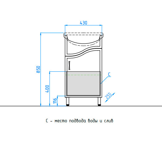 - напольная тумба под раковину: распашная дверца, металлическая ручка, ножки.