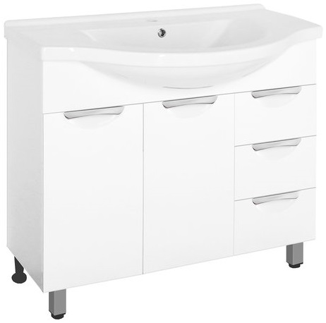 - напольная тумба под раковину: 2 распашные дверцы, 3 выдвижных ящика, стильные врезные ручки, ножки