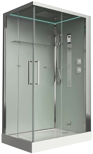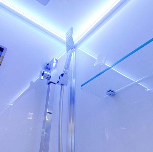 Кабина снабжена встроенной радиосистемой, вентиляцией и семицветной хромотерапией для проведения оздоровительных процедур. Управление всеми функциями – электронное, с помощью влагозащищённого сенсорного пульта.