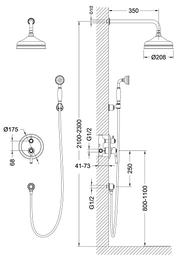Смеситель, лейка, шланг, штанга, верхний душ, крепление