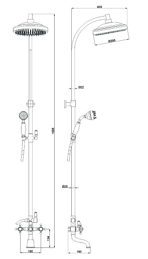 Описание: Душевая система с двумя рукоятками, с изливом, 3 - режимная. Керамический кран-букс. Диаметр тропического душа-160 мм.Характеристики