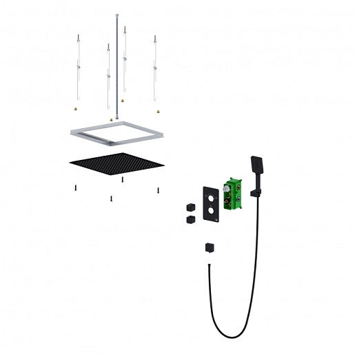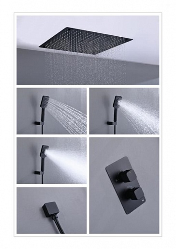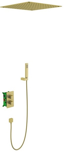 Комплектация:Смеситель с монтажной коробкой, скрытого монтажа, с термостатом - 1 шт. Тропический душ, потолочный, скрытого монтажа, (латунный) с монтажной коробкой - 1 шт. Подвесные кронштейны для тропической лейки - 1 шт. Подводка к тропической лейке 1 м - 1 шт. Ручная лейка (пластик) - 1 шт. Держатель ручной лейки (пластик) - 1 шт. Декоративная накладка смесителя (латунная) - 1 шт. Ручка дивертора - 1 шт. Ручка управления термостатом - 1 шт. Шланг душа 1,5 м - 1 шт. Отвод из стены - 1 шт. Инструкция - 1 шт.