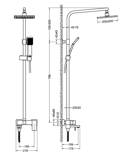 Смеситель, лейка, шланг, штанга, верхний душ, крепление