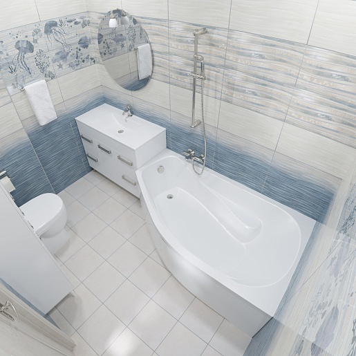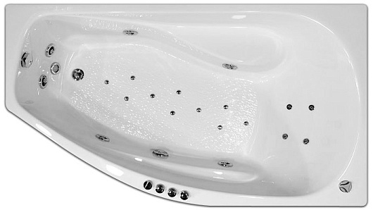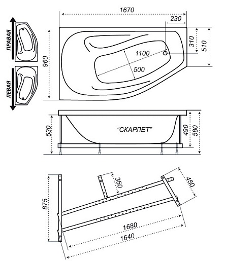 Скарлет L – акриловая ванна ассиметричной формы, рассчитанная на угловое размещение. Соотношение её сторон составляет 167 на 96 сантиметров, при высоте на ножках каркаса 58 см её глубина составляет 38 см. Ванна вмещает в себя 250 литров воды. Возможна как лево-, так и правосторонняя установка.