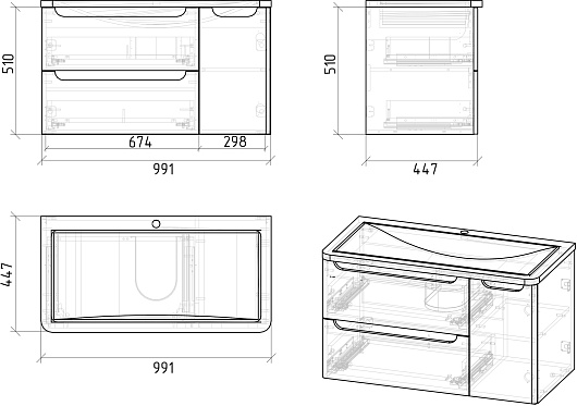 - 2 выдвижных ящика, 1 распашная дверца.