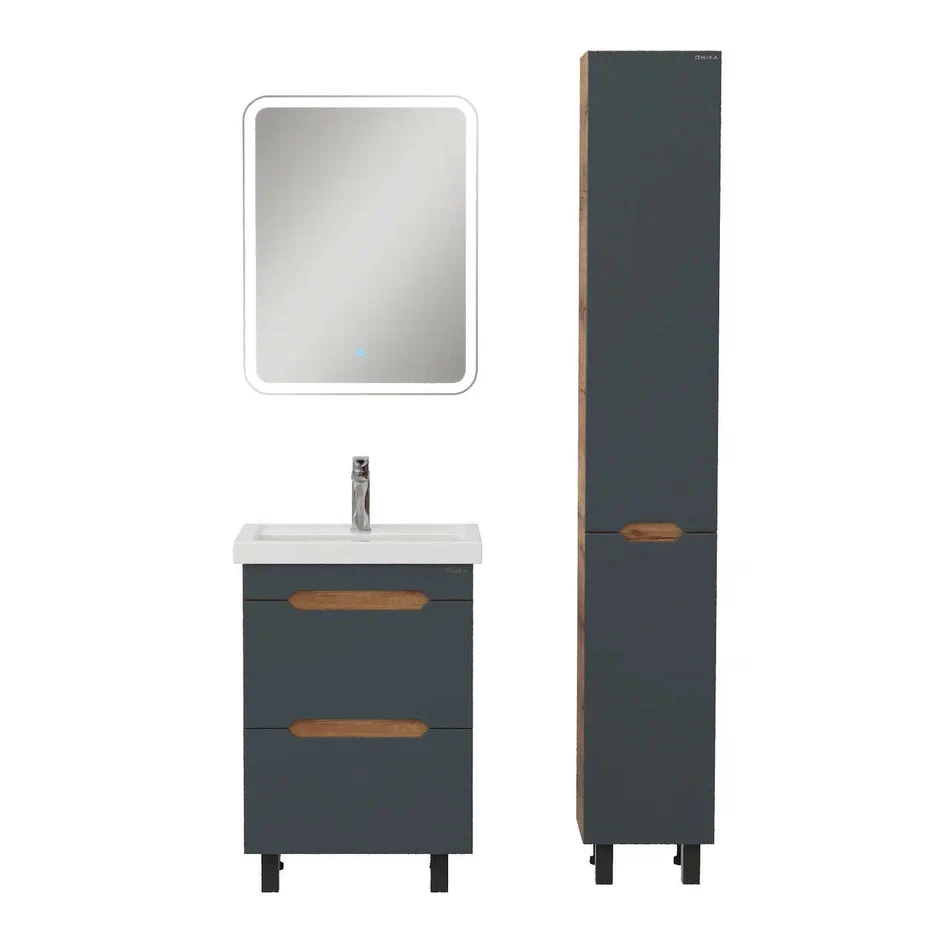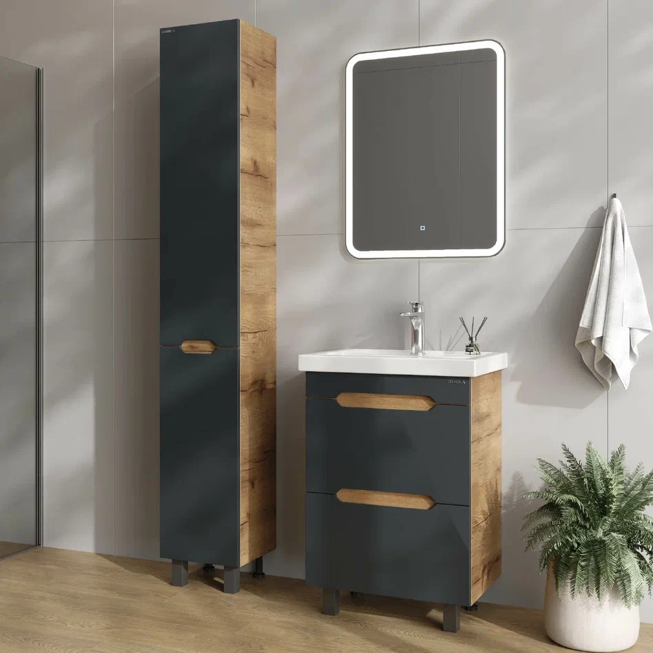 - Тумба впишется в любой интерьер благодаря трендовому сочетанию матового графита и золотого дуба, а также поможет эффективно организовать пространство, что особенно важно в небольших ванных комнатах.