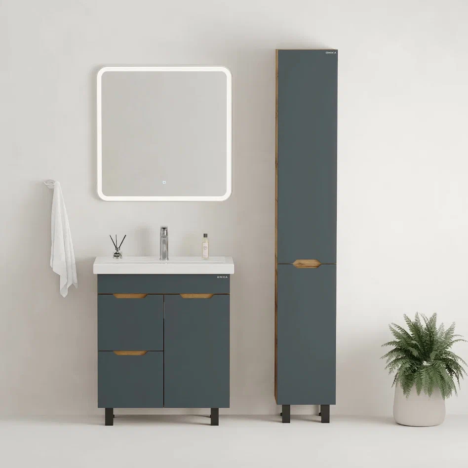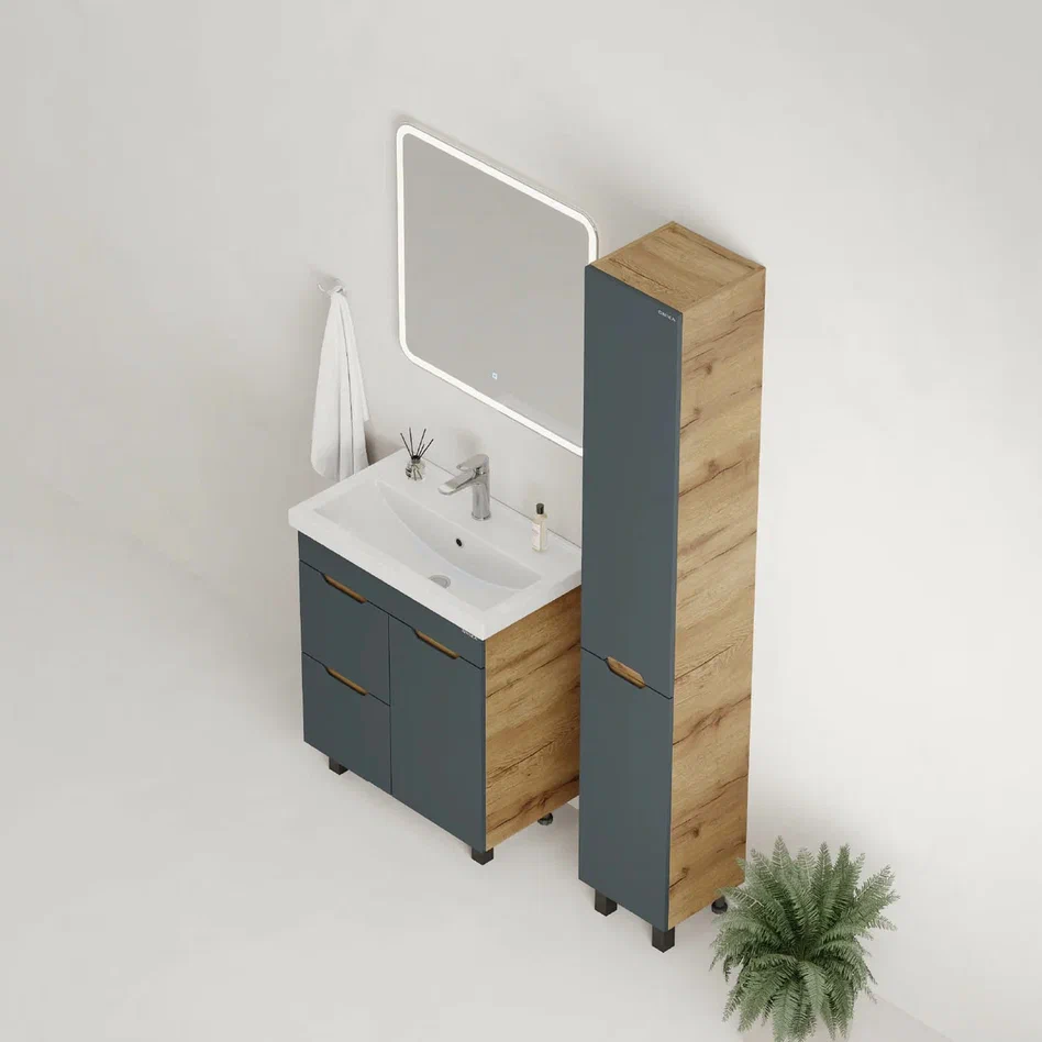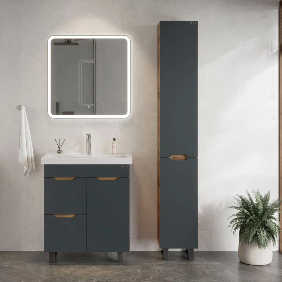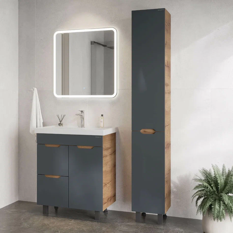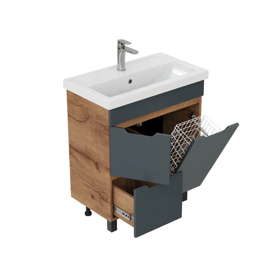 - Тумба впишется в любой интерьер благодаря трендовому сочетанию матового графита и золотого дуба, а также поможет эффективно организовать пространство, что особенно важно в небольших ванных комнатах.