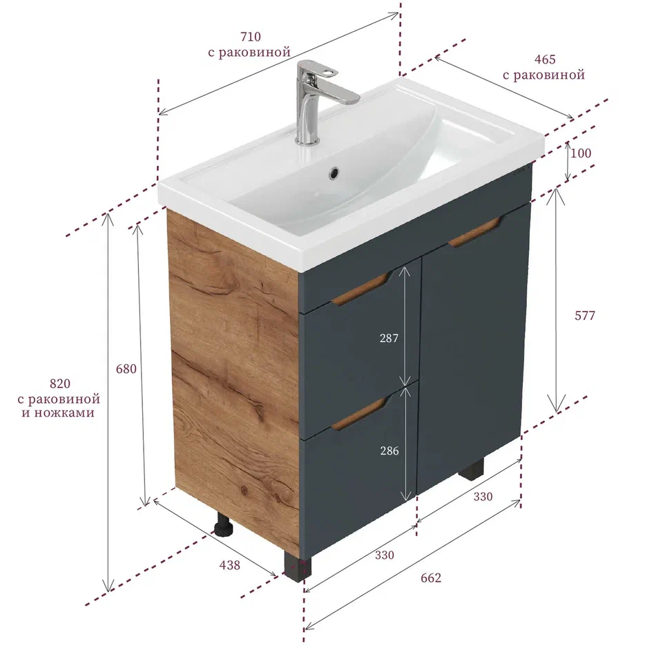 - Размеры тумбы без учета раковины и ножек 66х44х68 см.