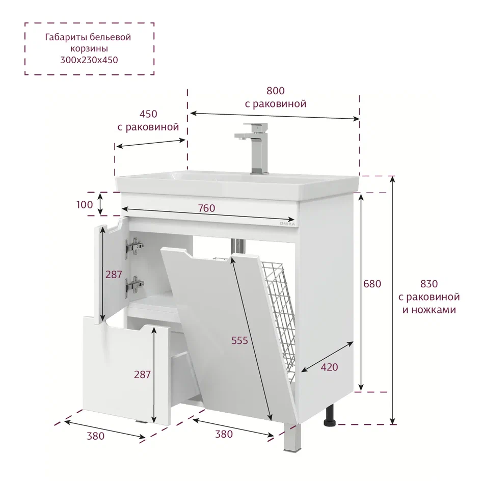 - В левой части тумбы расположено пространство за дверцей с доводчиком, под ним ящик с направляющими полного выдвижения, в правой части - откидная дверь с корзиной для белья.