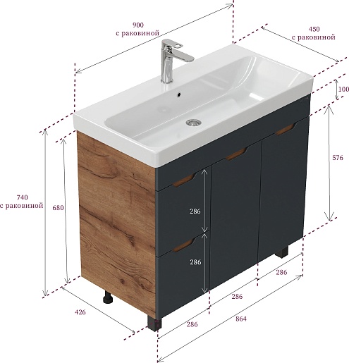 Onika Тумба под раковину Айленд 90 с б/к графит/дуб крафт