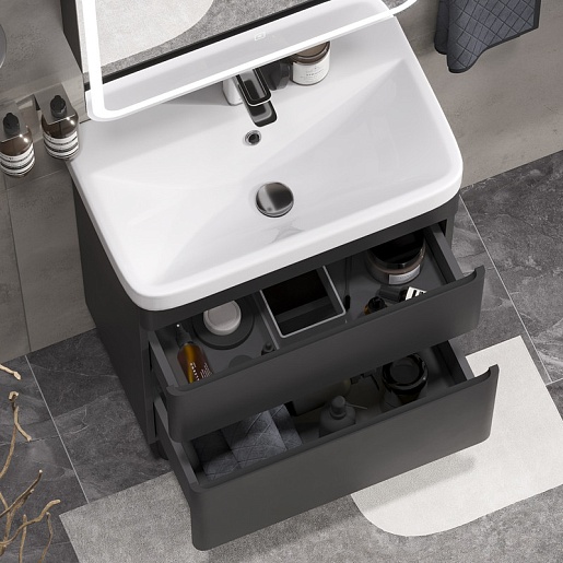 - Фасад и корпус тумбы изготовлены из МДФ и покрыты черной матовой пленкой ПВХ с эффектом Soft Touch.