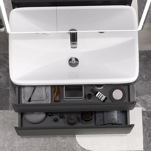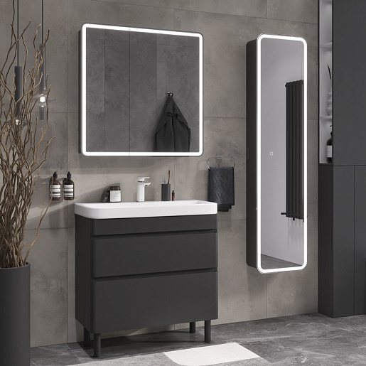 - Фасад и корпус тумбы изготовлены из МДФ и покрыты черной матовой пленкой ПВХ с эффектом Soft Touch.