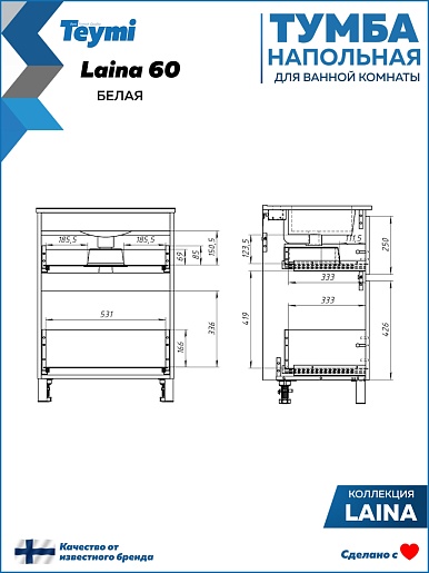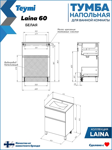 Напольная тумба под раковину Teymi Laina 60 белая - арт. T60817.