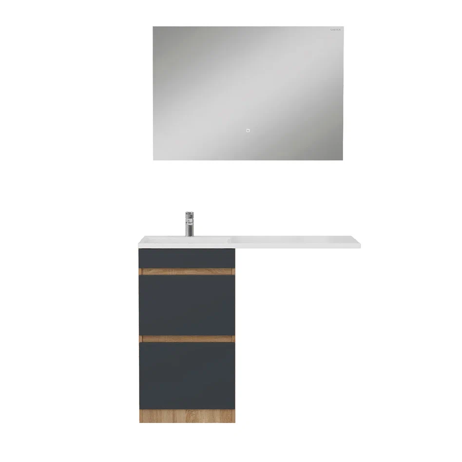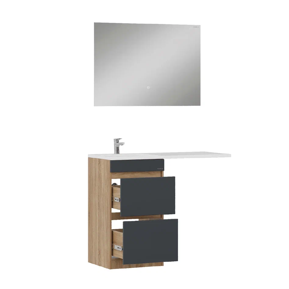 - Тумба имеет cерый матовый фасад с покрытием SoftTouch, корпус цвета дуб сонома с роскошной текстурой, строгие формы без декора, удобные интегрированные ручки и два ящика с направляющими полного выдвижения: нижний - предназначен для больших предметов, а верхний, имеющий удобную систему организации пространства, - для мелких аксессуаров.