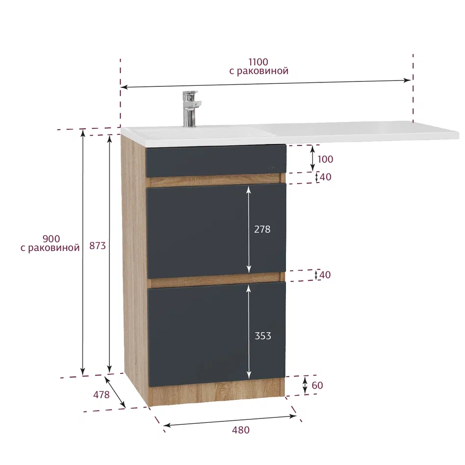 - Размеры тумбы без учета раковины 48х48х87 см.
