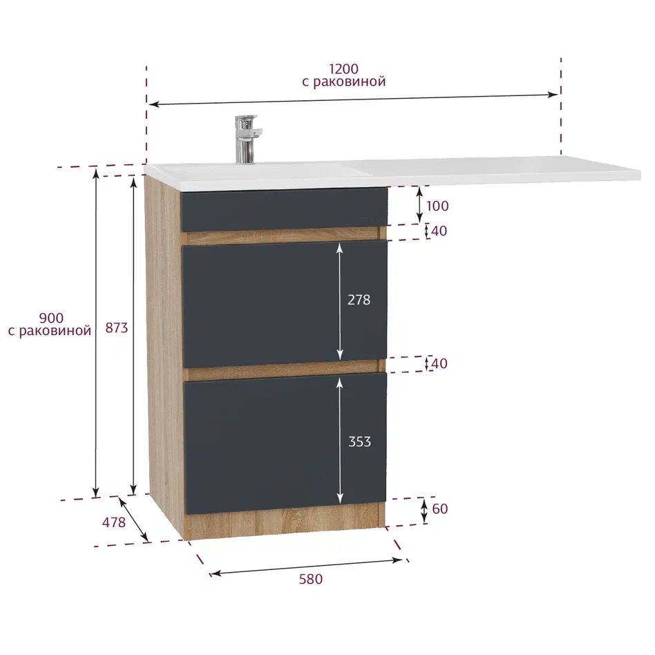 - Размеры тумбы без учета раковины 58х48х87 см.