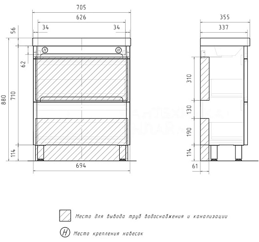 - Фасад тумбы изготовлен из МДФ и покрыт матовой эмалью. Корпус изготовлен из влагостойкого ЛДСП.