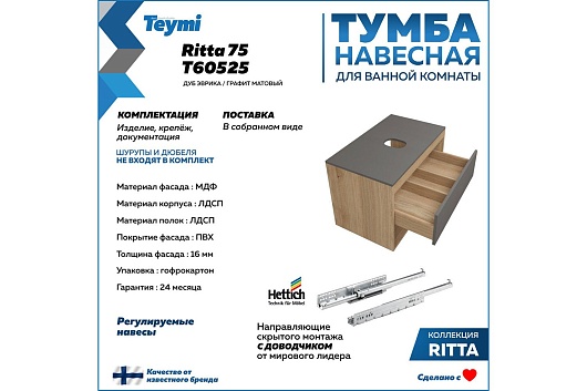 Teymi Тумба под раковину Ritta 75 дуб эврика/графит матовый подвесная T60525