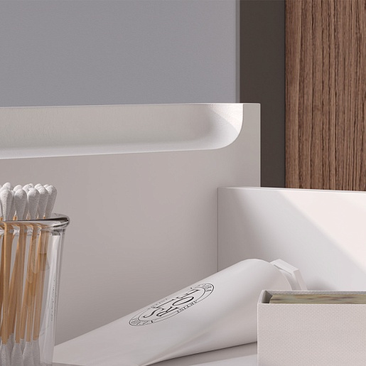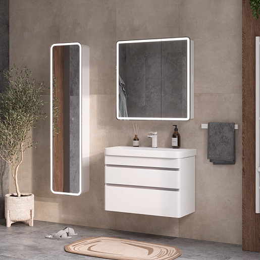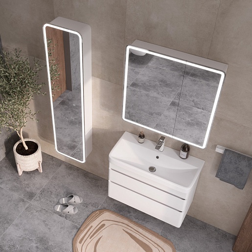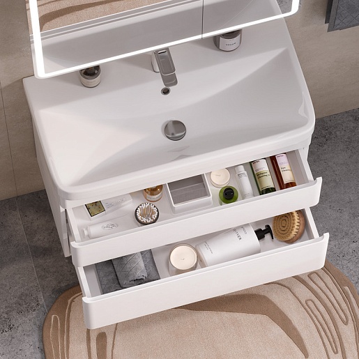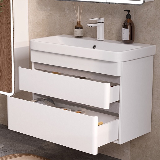 - Фасад и корпус тумбы изготовлены из МДФ и покрыты белой матовой пленкой ПВХ с эффектом Soft Touch.