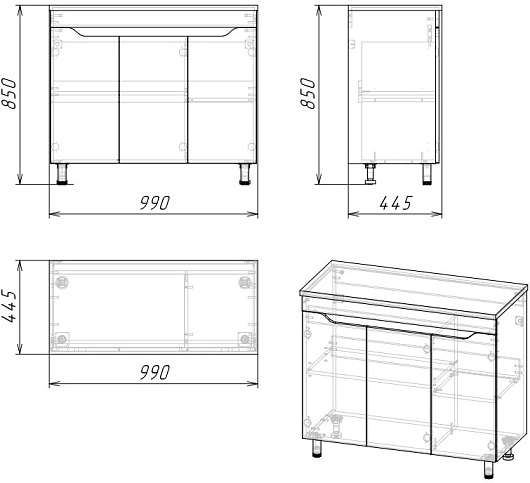 Комплектация: тумба, раковина, ножка (4 шт.).