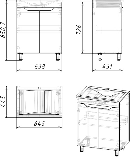 Комплектация: тумба, раковина, ножка (4 шт.).