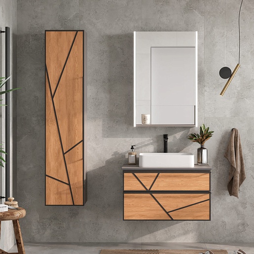 - Фасад тумбы изготовлен из МДФ и облицован матовой пленкой с текстурой дерева.
