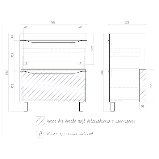 - Тумба крепится к стене и дополнительно опирается на ножки.