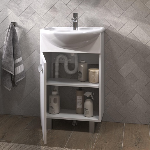 В комплекте: тумба, раковина, крепеж, ножка (3 шт.).