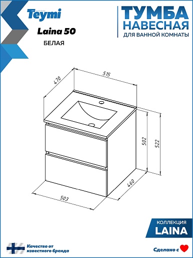 Подвесная тумба с раковиной Teymi Laina 50 белая - арт. T60801 / T51000.