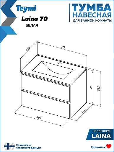 Подвесная тумба с раковиной Teymi Laina 70 белая - арт. T60803 / T51004.