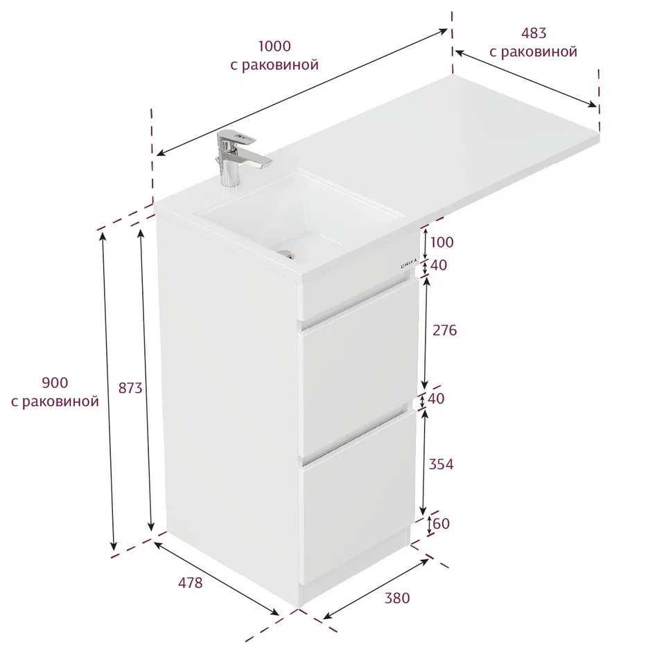 - Размеры тумбы без учета раковины 38х48х87 см.
