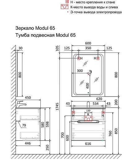 Тумба под раковину Modul 65 подвесная белая Mоl.01.62/P/W