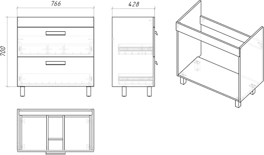 В комплекте: тумба, раковина, крепеж, ножка (4 шт.).