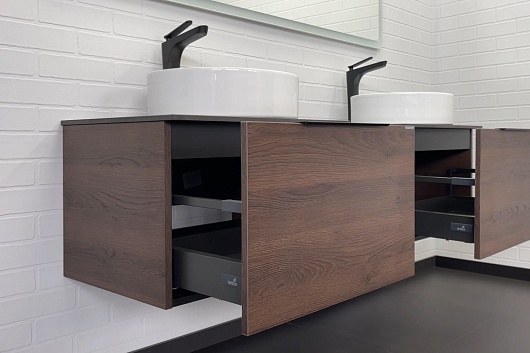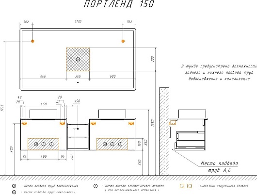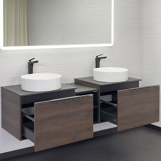 В комплекте: тумба Портленд 60 (2 шт.), тумба с нишей, раковина (2 шт.), столешница, крепеж.