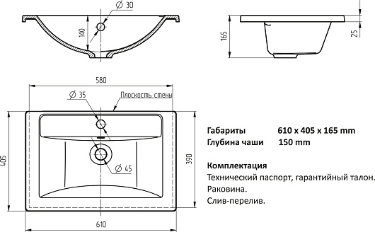 - Раковина из литьевого мрамора со слив-переливом.