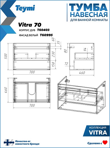 Подвесная тумба с раковиной Teymi Vitra 70 Волна дуб/белый - арт. T60403 / T60420 / T51004.